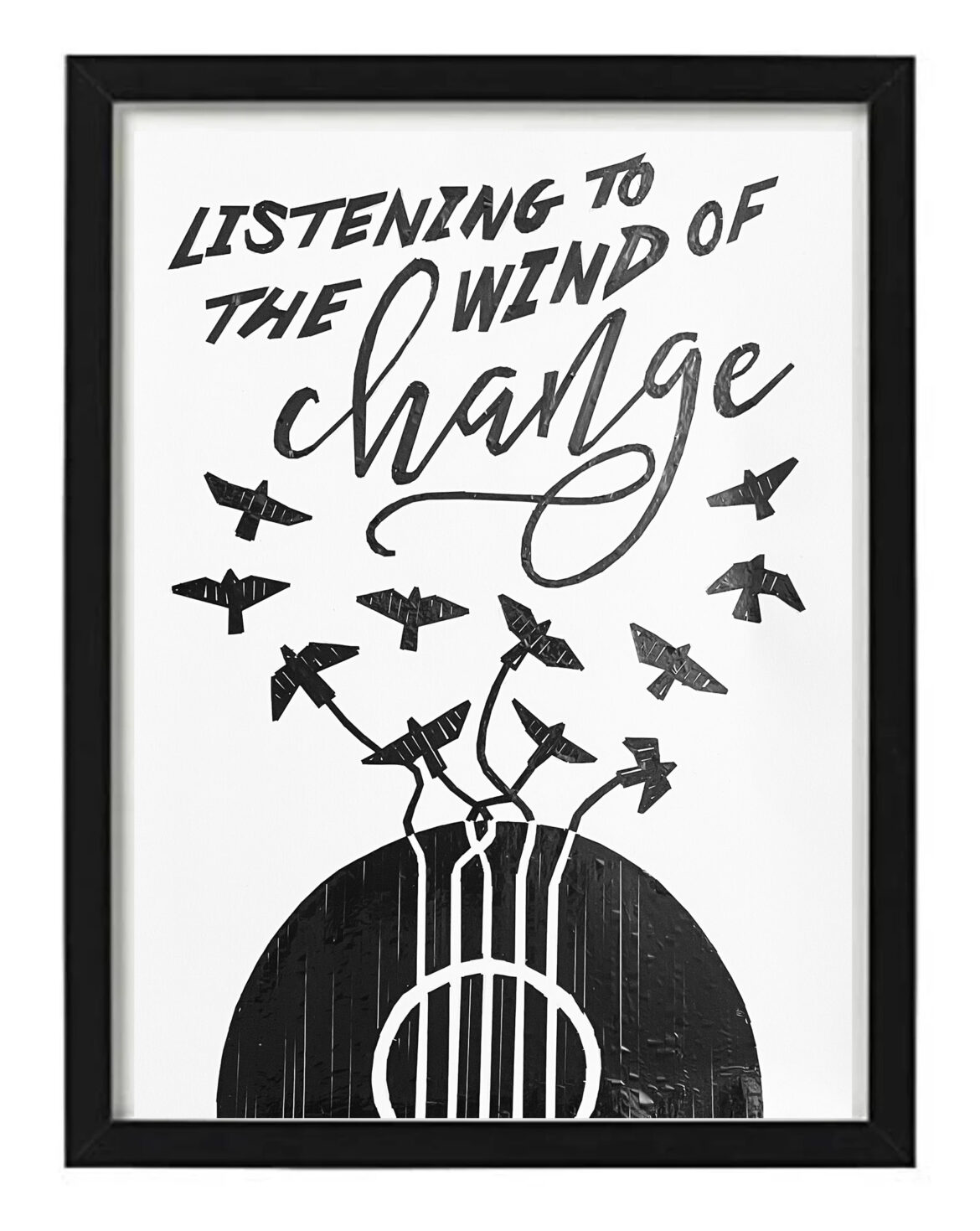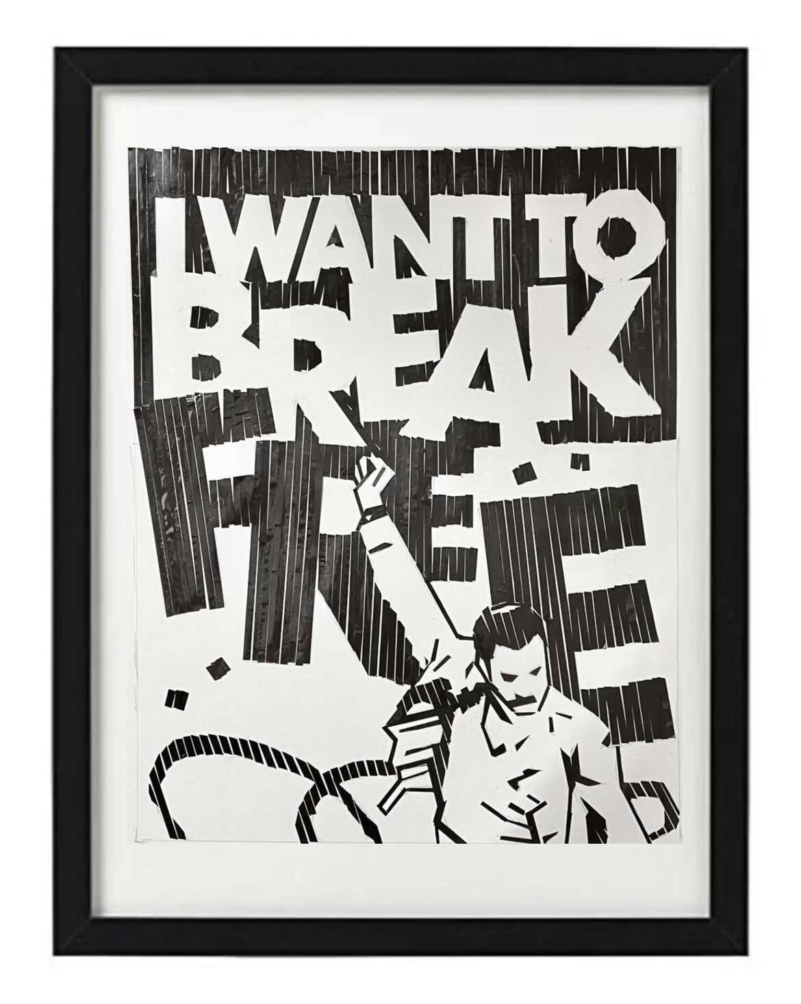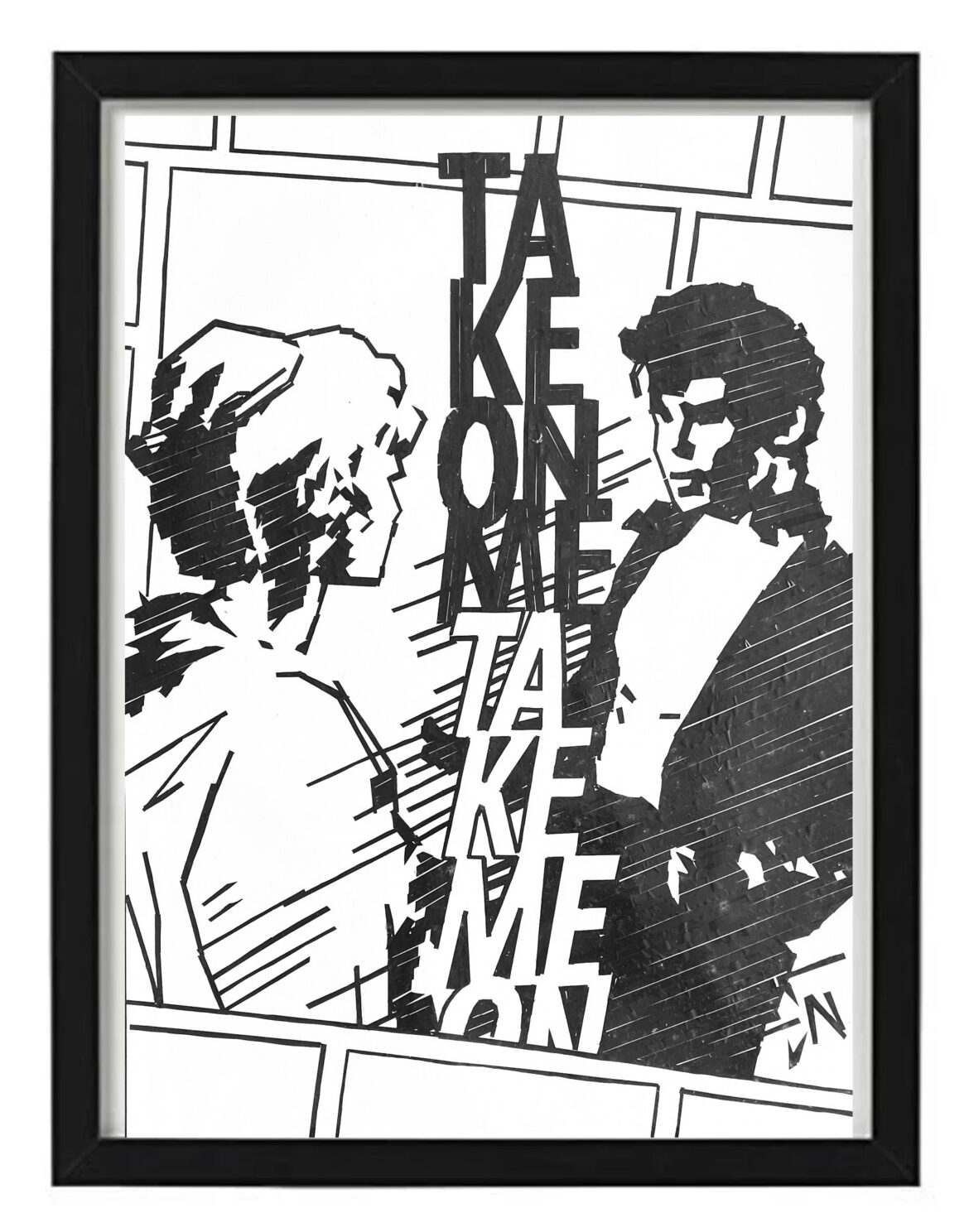 Over the past year I’ve moved onto creating song title or lyrics based artworks of classic songs that my generation grew up on. By using elements associated with the song, either by way of the lyrical content or associated album art or familiar music video visuals, these works have been a joy to create. From designing the artwork to rendering it with tape, the process is highly challenging and rewarding, and the final product serves as a handmade tribute to and a reminder of the greatness of the artists and their musical works.