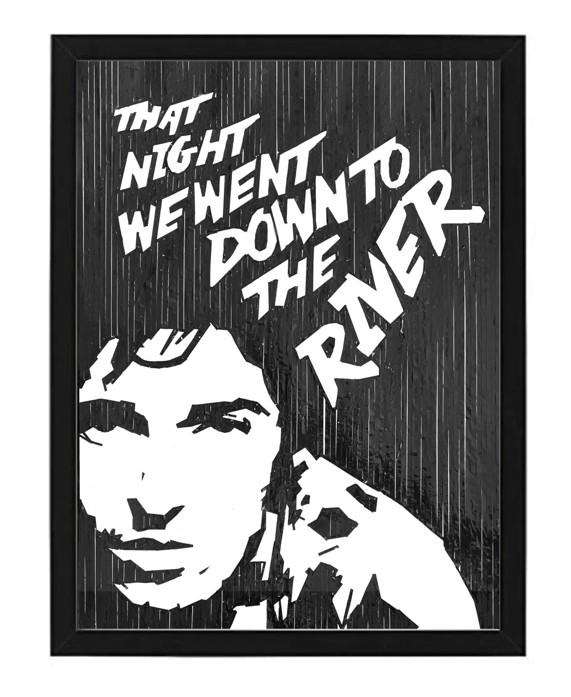 A friend of mine was a huge Leonard Cohen fan, having seen Cohen’s Live In London DVD a thousand times over. It seemed like a good idea at the time to work on a tape art piece of the DVD cover and present it to him, so I ambitiously enlarged my canvas and worked on an A1 size piece. Although I had figured a better method for rendering mid tones, the work progressed through trial and error, with whole areas being redone after being pasted.